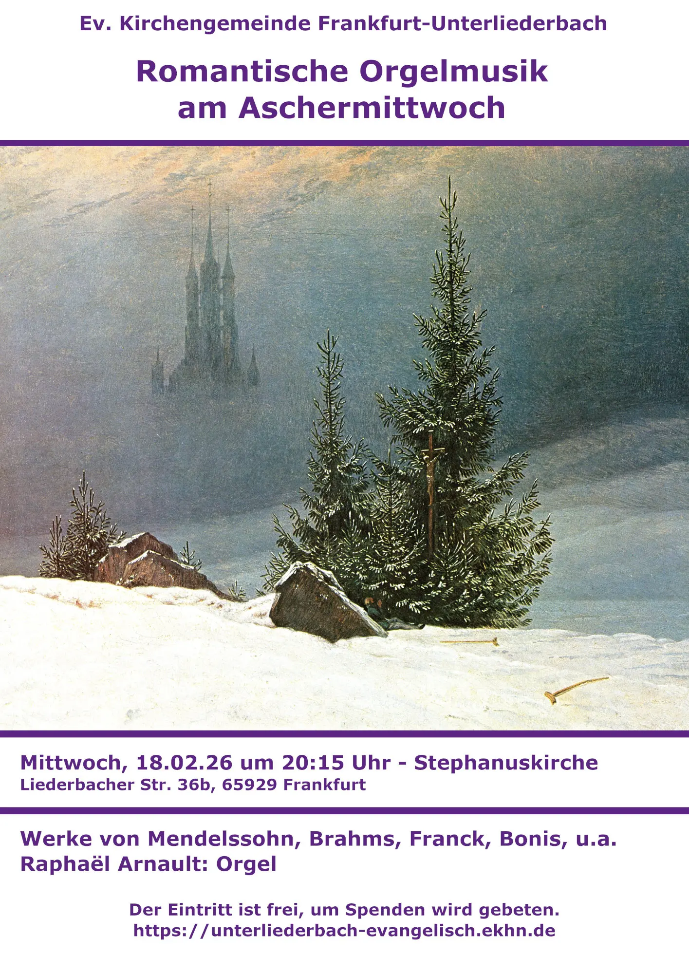 Am Mittwoch, den 18.02. beginnt die Passionszeit, die wir auch dieses Jahr wieder mit Musik eröffnen wollen. Um 20:15 Uhr findet ein Orgelkonzert in der Stephanuskirche statt. Ob mit choralgebundenen oder mit freien Orgelwerken war die Passionszeit im 19. Jahrhundert eine fruchtbare Inspirationsquelle. Mit Werken von Mendelssohn, Liszt, Franck und Théodore Dubois wird Raphaël Arnault die Vielfältigkeit dieser Literatur zeigen: Ob meditativ, traurig, hoffnungsvoll oder stürmisch, bergen diese Stücke viele Schätze, die entdeckt werden wollen. Das Konzert dient auch als Einstimmung auf das große Kantoreikonzert am Sonntag, den 22.03. um 18 Uhr, bei dem das dramatische Oratorium „Les sept paroles du Christ en croix” (Die sieben Worte Jesu am Kreuz) von Dubois erklingen wird.