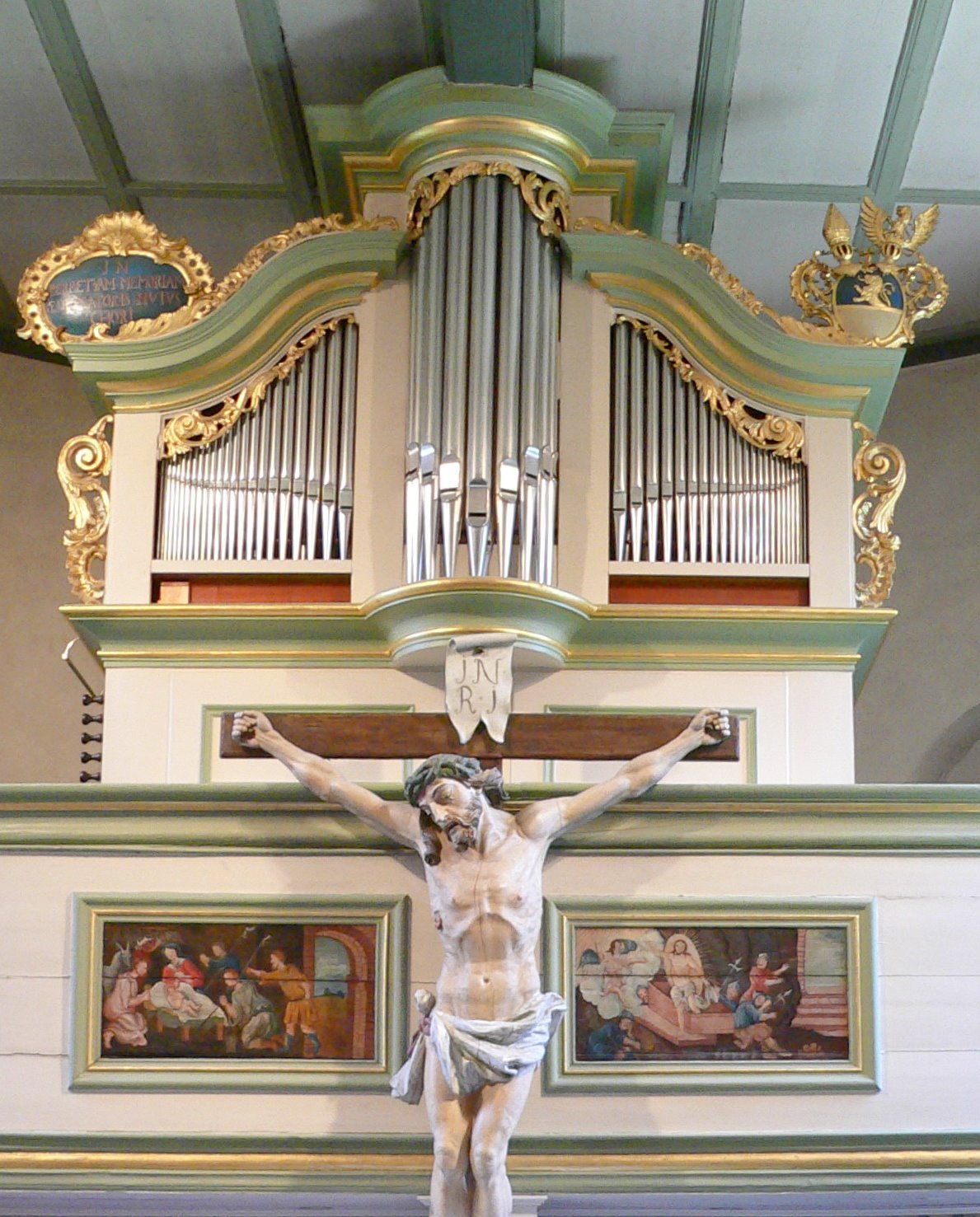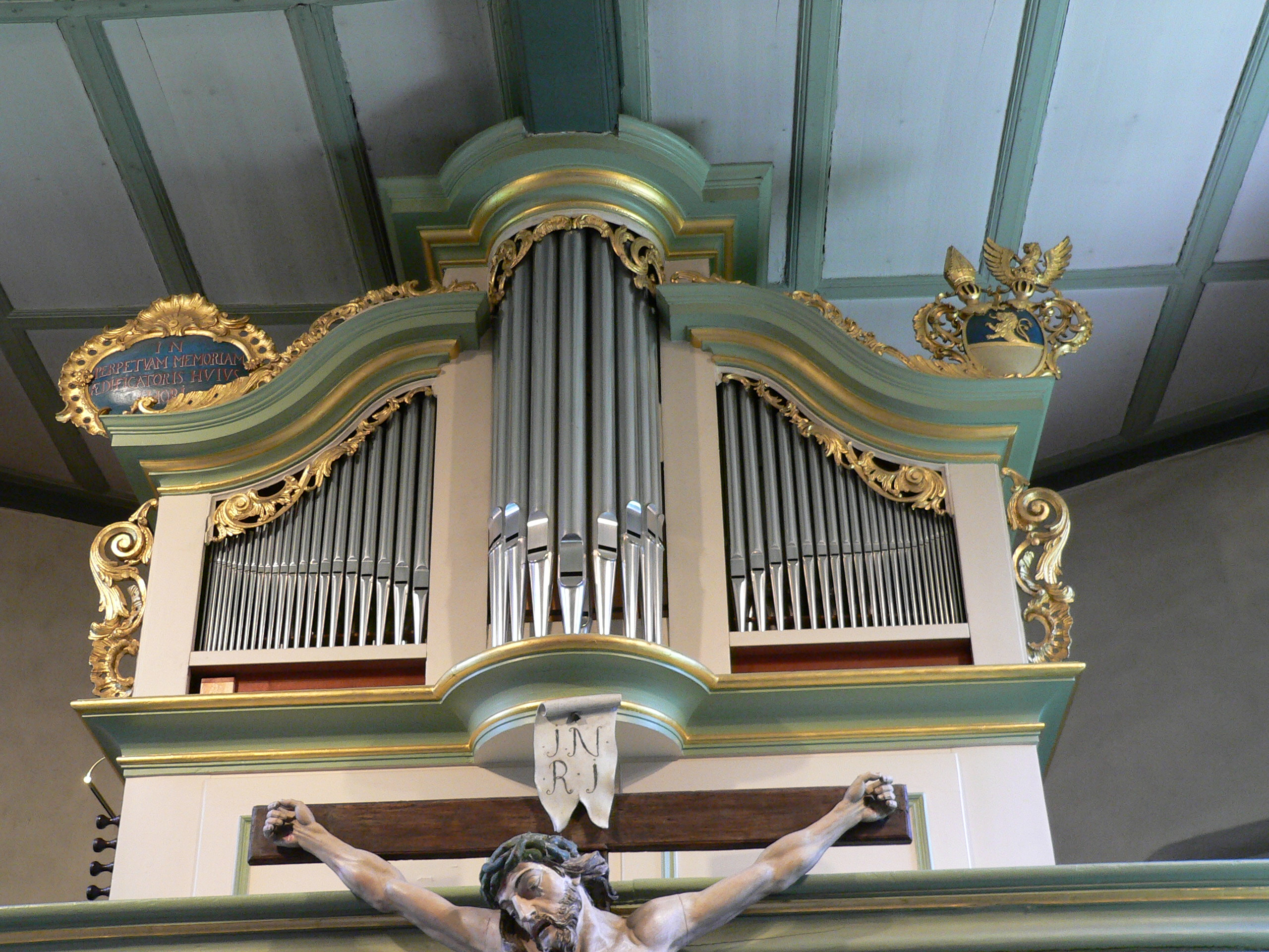 Bourdon 16’, Principal 8’, Viola da Gamba 8’, Gedackt 8’, Octave 4’, Waldflöte 4’, Cornett 3fach 2 2/3’, Superoctave 2’, Schwiegel 2’, Mixtur 4fach 1 1/3’, Trompete 8’